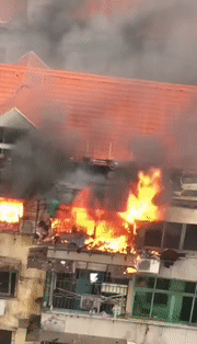 目击者拍摄的现场视频中,熊熊大火从楼房顶层的防盗网蹿出。