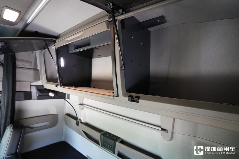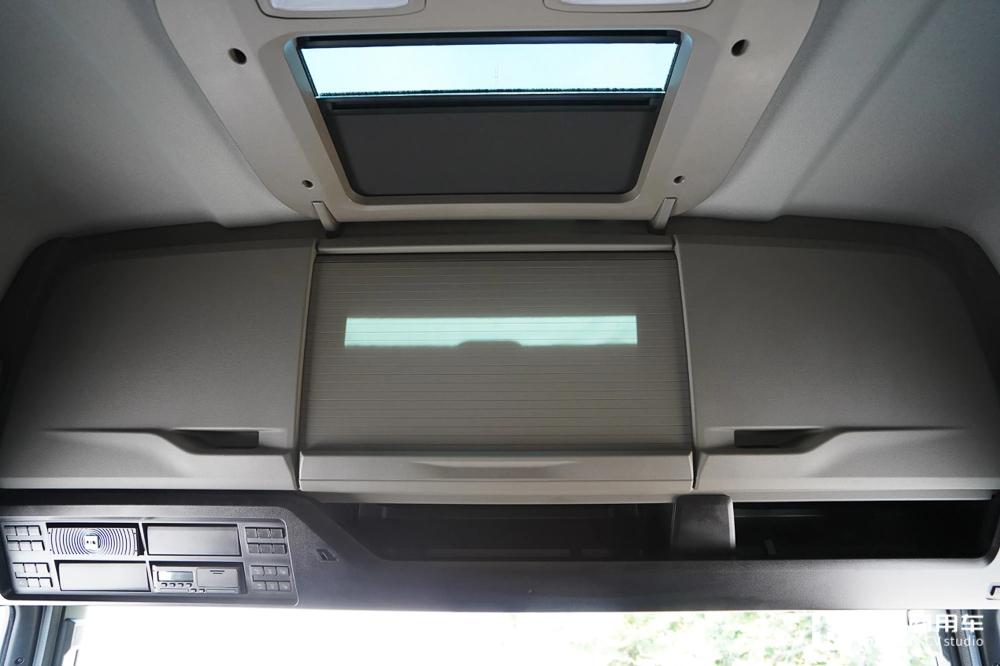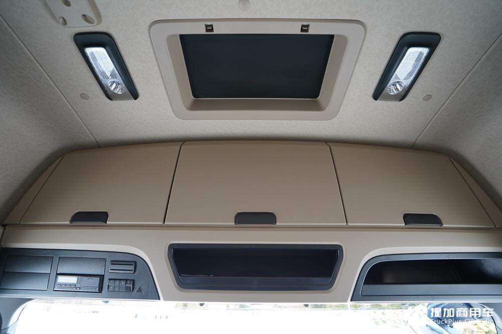驾驶室内部储物空间相当丰富,配备三个顶部吊柜,并带有天窗