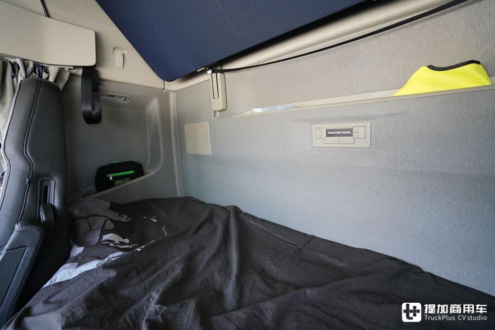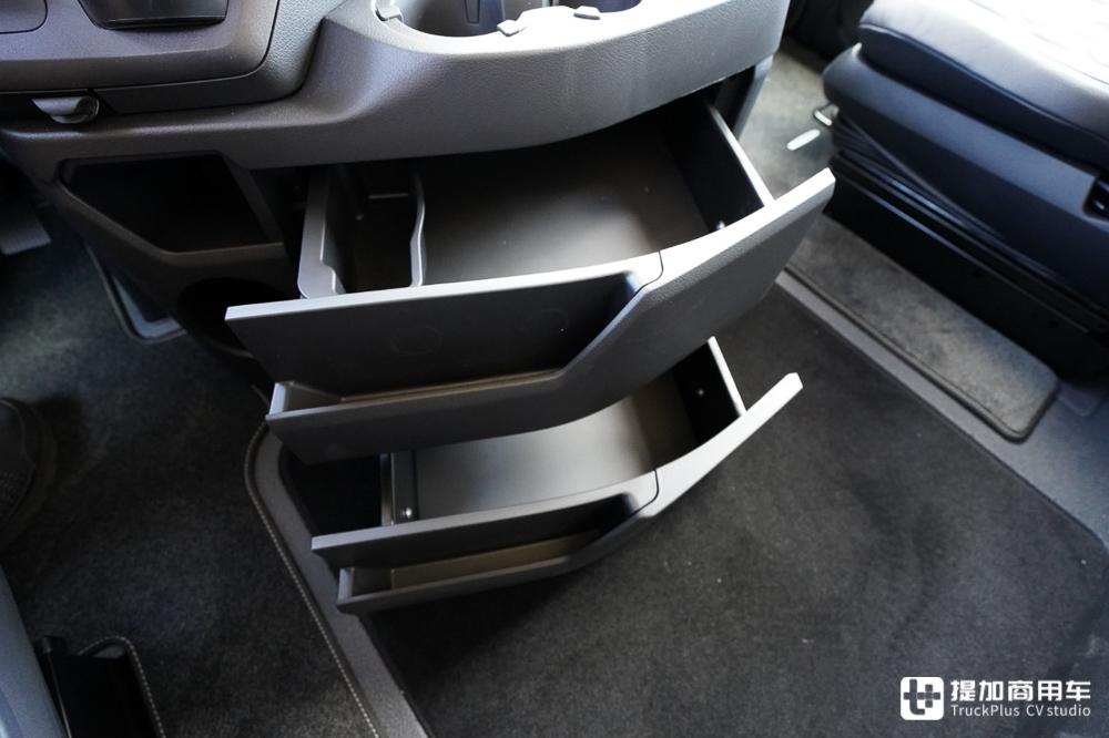 驾驶室内部的空间十分充裕,一样安装了三个大尺寸顶部吊柜