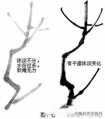 用较大的笔,先用清水调墨,使笔尖、笔腹、笔根都含淡墨(宜稍干),再以笔尖蘸浓墨,然后在盘子里稍加调整,使浓淡墨浑然结合。落笔时以侧锋为主,要胸有成竹,大胆沉着,运笔要稳健,有快慢、顿挫、转折。干湿浓淡依结构随之变化,一笔“写出”老干的雄健之气。在主干和梗枝结合部,用笔要由侧锋渐转中锋。反之,则由中锋渐转侧锋。交替转换笔锋,方能自然生动。