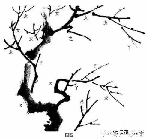 在历史长河中,经历代画家辛勤探索、概括总结,逐步形成了梅枝的造型规律,借鉴文字的形态,如“女”“之”“丫”“丛”“S” 形等,作为梅枝的基本造型单位,从而方便了初学者入门和掌握技法的进程。