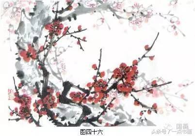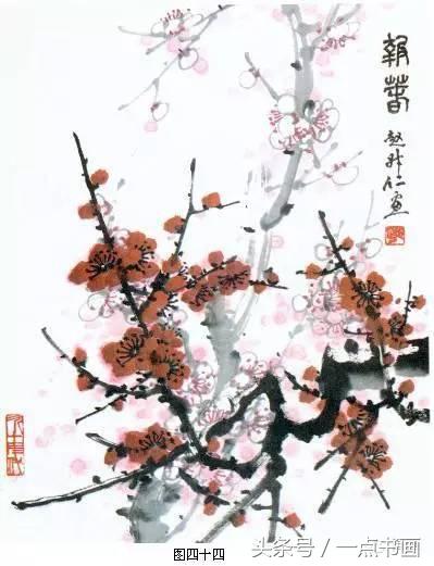 图45,在构图上除两枝梅花有主辅之分外,在左上方留出大块空白,即是为了求得虚实果。