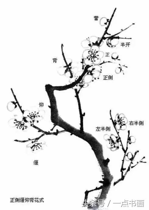 全侧的花:一般画三瓣即可,中间较大,两侧较小,露出一部分花须、蕊头。因透视角度不同,有些全侧花可不点须蕊。 花蕾:呈圆形,比花朵小,有的紧包未开,画成圆圈即可。初绽的,两三个圆弧交叠便成。先画枝,后画蕾,蕾多生在枝梢。画蕾,用浓墨点托,显其精神。