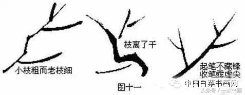 在具体着笔时,并非一张画上都要同时出现所有的形态,或只出现某种形态。而要看具体需要,如大构图和小构图,画全树和画折枝,在枝干的造型要求,数量多少和疏密程度都不相同,因此作画时要灵活运用规律,切忌机械生硬。一般是“女”、“丫”字形较多,不论是主枝、旁枝、细枝,都以上下左右不同角度的“女”形出枝为多见。在枝梢则以“丫”形为多。画嫩枝时,分叉还不太长,未形成穿插交错的透视果,也以“丫”字形为多。“S”、“之”字形,在一幅画上的不宜过多。“丛”形枝实际上是两个“丫”形的并列,画时不要过于平行等长,应一长一短才有变化。“之”字形一般多在枝干的右侧出现,这是笔顺之缘故,向左则成“S”形。