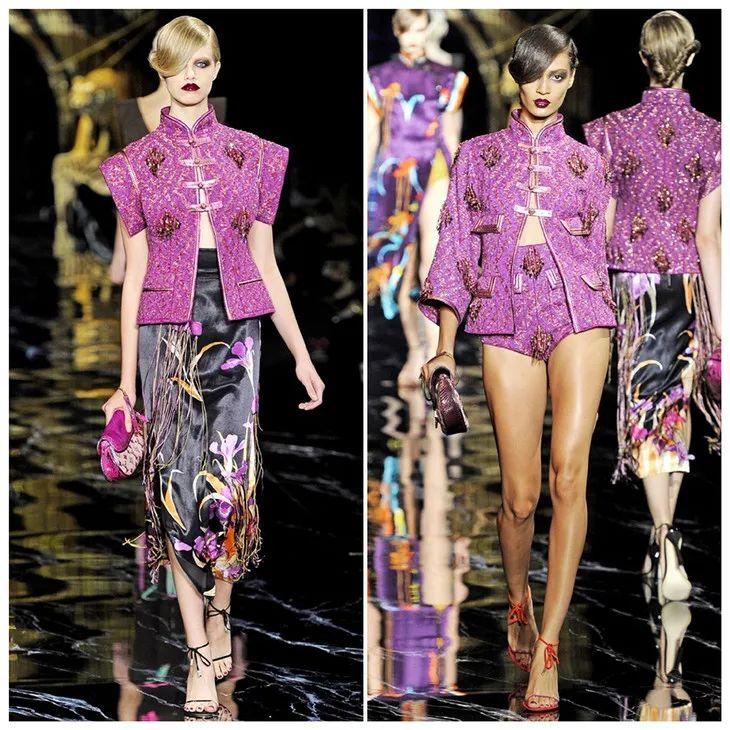 关于旗袍的体现,则在Tom Ford执掌YSL时期的后一季玩得淋漓尽致。以旗袍为主,龙袍织锦刺绣搭配鲜明的色彩,整个系列都是浓郁的中国风。