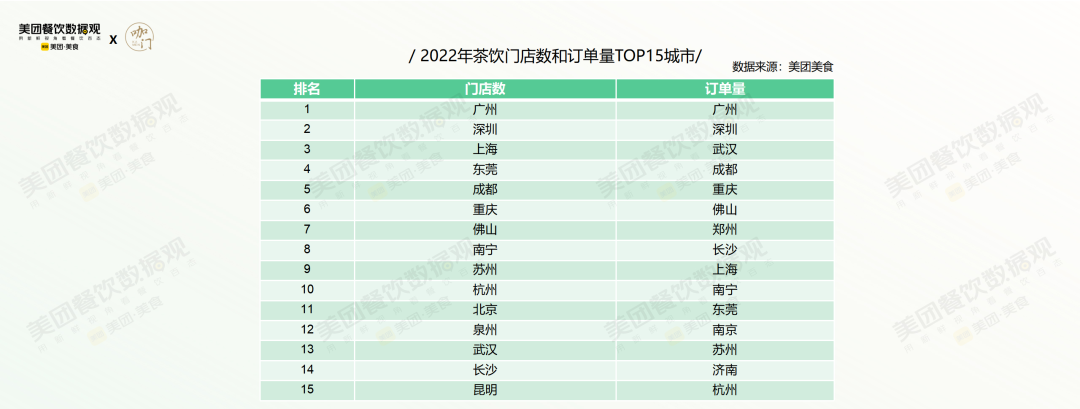 美团数据统计,2022年茶饮订单量或门店数上榜TOP10城市均包括:广州、深圳、上海、成都、重庆、佛山、南宁、苏州、杭州等;佛山、南宁等小众城市数据表现不俗,值得未来关注。