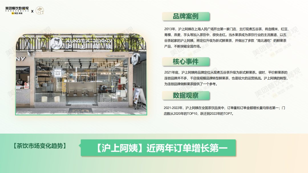 2022年沪上阿姨订单同比增长量排全国茶饮品牌第一,其次是茶百道、吾饮良品,近两年较火的柠檬茶主打品牌也纷纷上榜。