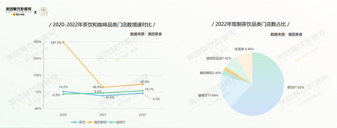 经历了几年时间的高速发展,加上疫情影响,美团数据显示,从近3年的门店发展来看,现制茶饮门店增速放缓,其2022年门店数增速低于现制咖啡14.8个百分点。