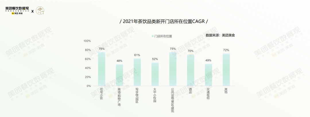 从2021年美团数据来看,茶饮新开门店更倾向于住宅小区,其次是写字楼/园区。