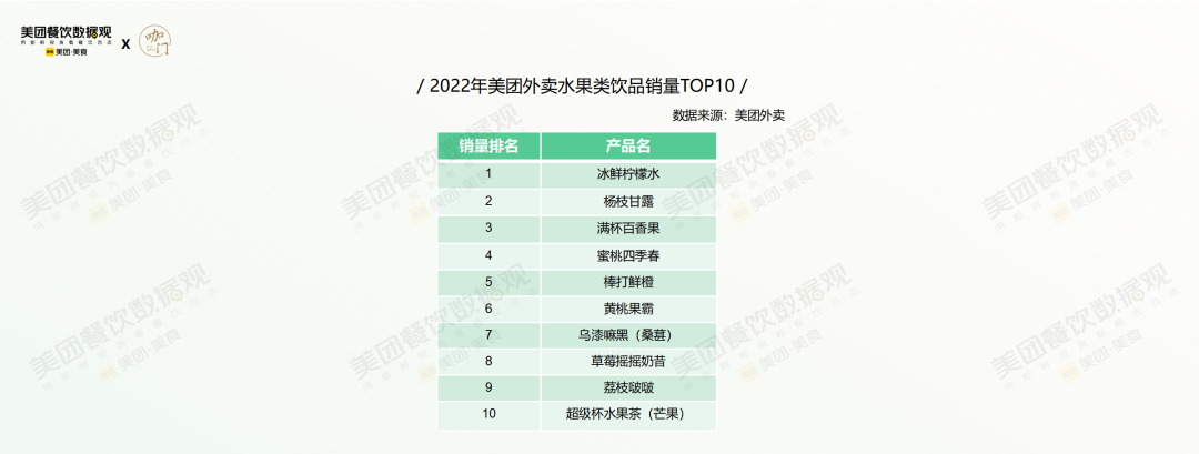 2022年水果类茶饮销量排行:冰鲜柠檬水、杨枝甘露、满杯百香果位列前三;
