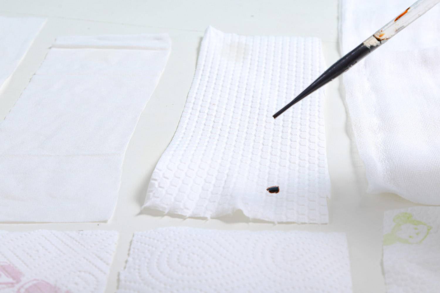 我又准备了8块干净的厨房纸,用滴管取来了食用油和酱油,分别厨房纸上滴3滴。