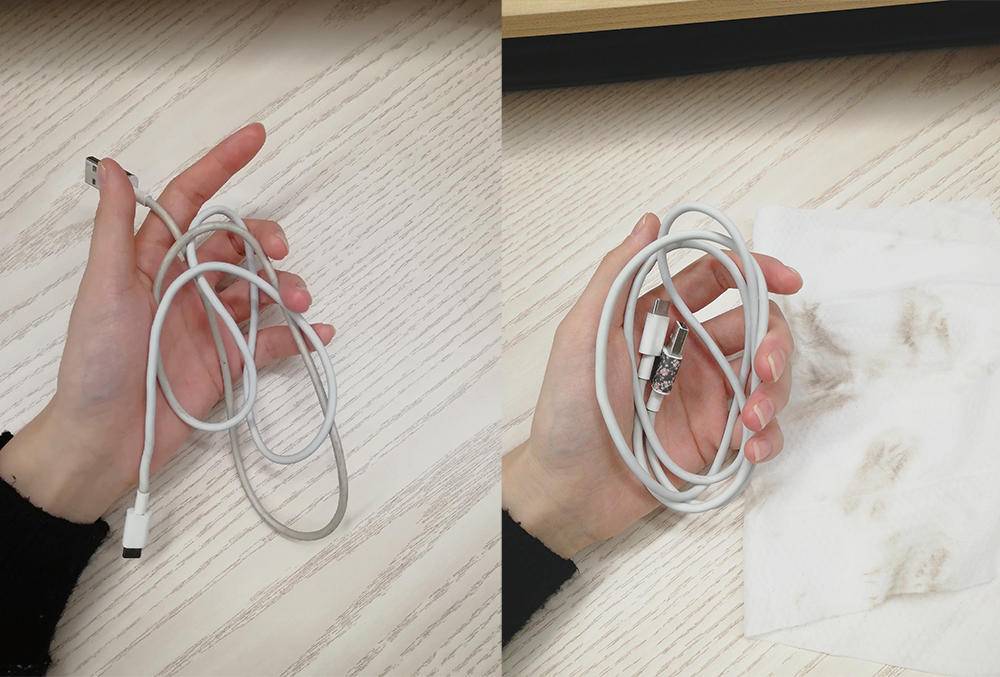 左边是擦了一半的数据线,右边是全部擦完之后的数据线,干净得和新买的一样。
