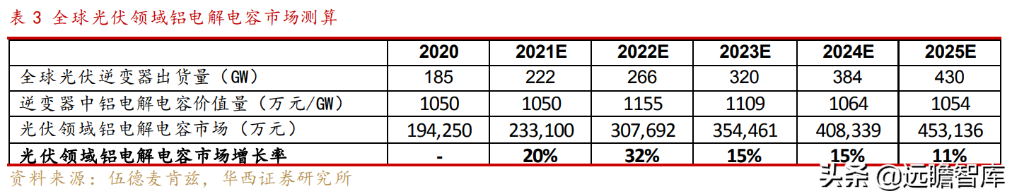 按照光伏逆变器市场规模 20%增速,预计 2025 年光伏领域铝电解电容市场将达到 45.31 亿元。光伏领域的铝电解电容器推动了高压电极箔市场规模的扩大。