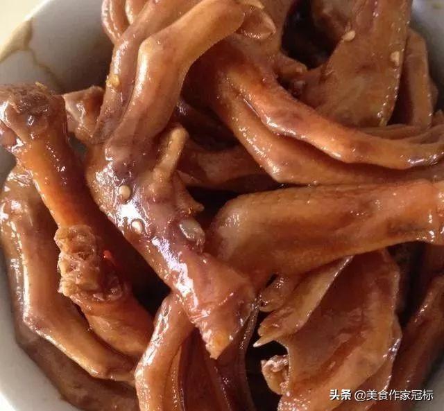 先洗干净装一锅凉水把鸭爪冷水锅里煮约3分钟,捞出来冲洗干净。把所有的食材放入锅中一起先用大火煮开,然后转中小火,(各位用料可以根据自己的量调整)料酒是两种酱油的两倍可放,我没放盐,放入的开水刚淹没鸭爪即可。然后一直用焖烧的方法煮,偶尔的翻面搅拌一下。煮的过程中一定要观察汤料多少,加盖一直小火焖,直到所有汤料焖干,要经常用筷子拨动,使鸭爪受热均匀。汤料闷干收汁完成后,美味的鸭爪就做好了,准备开吃,装盘。美味鸭爪好吃看得见了吧香卤鸭掌(好吃得不得了)