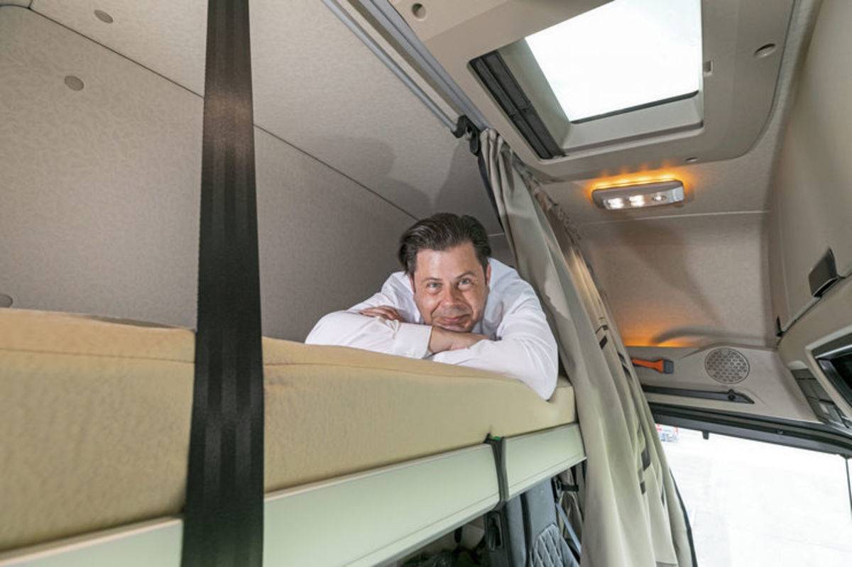 取消下卧铺,意味着卡友只能在上卧铺休息,针对这样的情况,新款Actros L对上卧铺进行了加宽,尺寸达到了90cm左右,可以满足一位成年男性的正常休息,并且卧铺床垫进行了加厚设计,上方搭配有窗帘,能够在夜间提供更好的静谧性,只是在上下卧铺和收拾时相对比较麻烦。