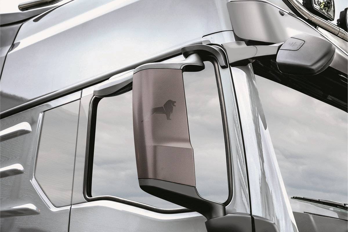不过曼恩和斯堪尼亚由于车型上市时间相对较早,也是对比中唯二没有装配电子后视镜的车型,但是相比于充满科技感的电子后视镜而言,MAN TGX Individual S传统后视镜上的碳纤维外壳,更能收获不少国内卡友的芳心。当然现如今MAN和斯堪尼亚也已经陆续推出了自家的电子后视镜设计,欧洲的卡友如果现在购车已经可以进行选装。