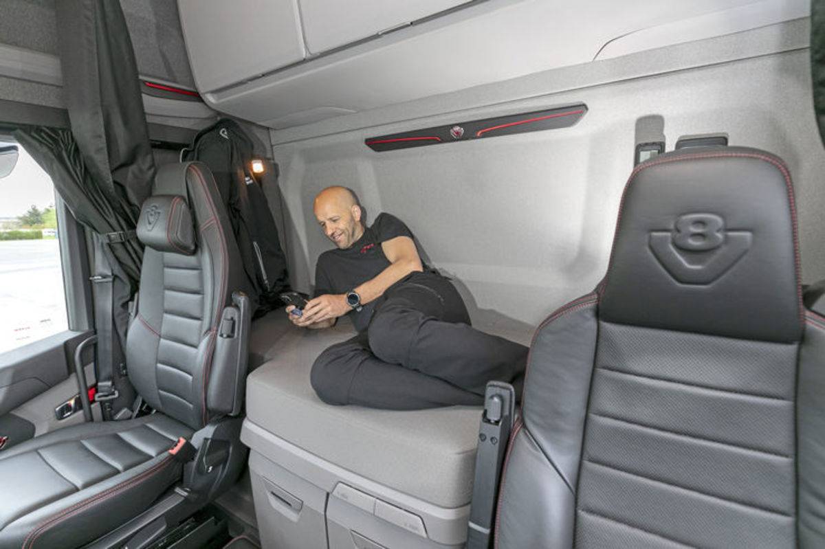 如果说达夫、斯堪尼亚、曼恩是双人套间改装的单人房,那么奔驰Actros L就是妥妥的专为单人设计的“豪宅”。目前奔驰Actros L分为三种驾驶室设计,分别为S-space、B-space以及G-space,由小到大,实拍的这台奔驰Actros L则是采用了大的G-space驾驶室设计,其内部三围尺寸同达夫XG+一样,阔绰。