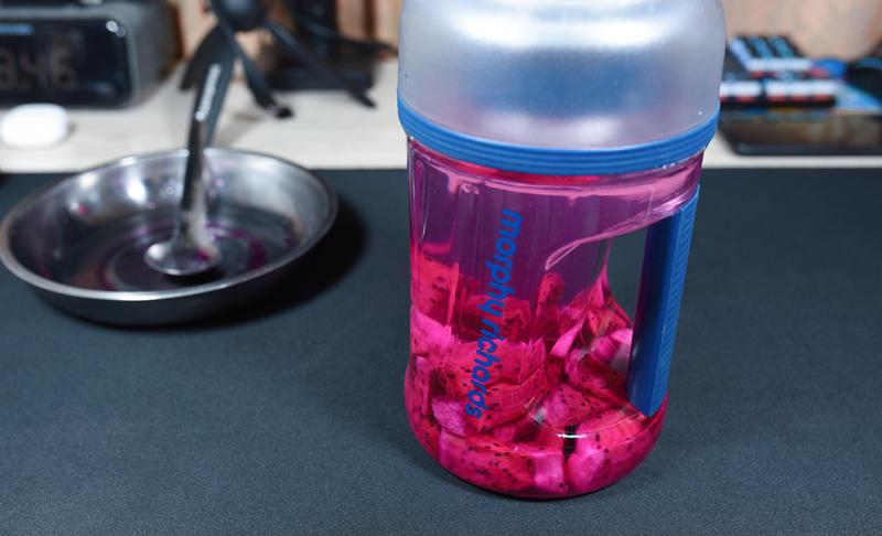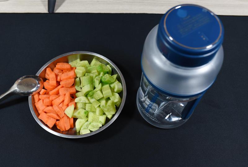 ▲经常会买水果的我来说,我更喜欢喝鲜果茶,实际操作简单,将需要榨取的食材切到约1cm的块状,注入适量的清水,60°的温水果更佳,无需接近沸水,更容易软化促进切削。开机后果断反方向放置即可。夏季可以将榨取后的芒果汁分装放入冰箱冷却。