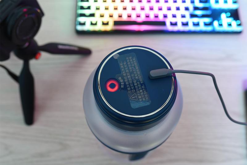 ▲核心榨汁技术就是这个大杯盖,厂商贴心的在杯盖上贴附了注意事项,使用需充满电后操作,和长期不适用需要将电量充满再放置。杯盖上的设计包括开机按键继承了充电提示灯,充电方式为磁吸的两颗铜制触点,所有装备都喜欢磁吸的元素,方便,而且使用寿命长,内置1500mAh*2的锂电池,续航达到了可以榨取10杯饮品。