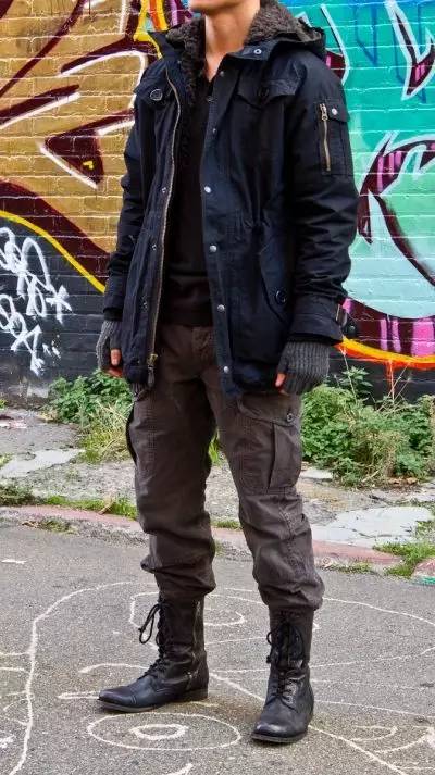 如果想要尝试休闲一点的搭配,工装外套搭配卡其色斜纹裤是不错的选择↓↓↓