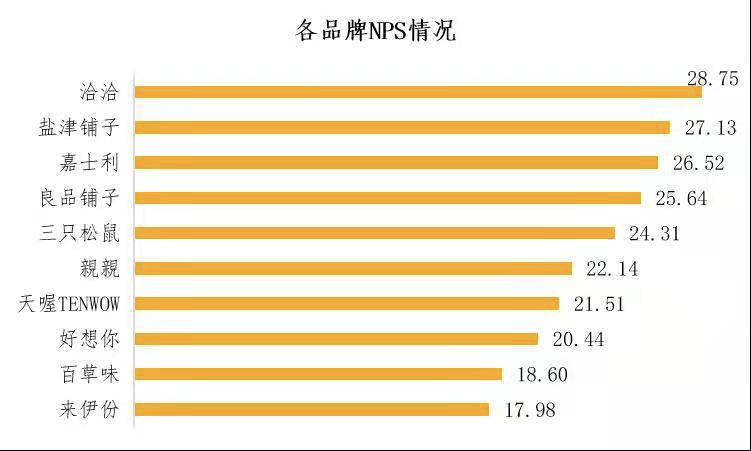 本次调查的10个休闲零食品牌,其平均消费者推荐指数为23.30,各品牌推荐度得分差异不大,就行业整体而言消费者口碑较好。洽洽NPS净推荐值,为28.75;其次是盐津铺子,为27.13;排名第三的是嘉士利,为26.52;其他休闲品牌推荐值均在17-26之间。