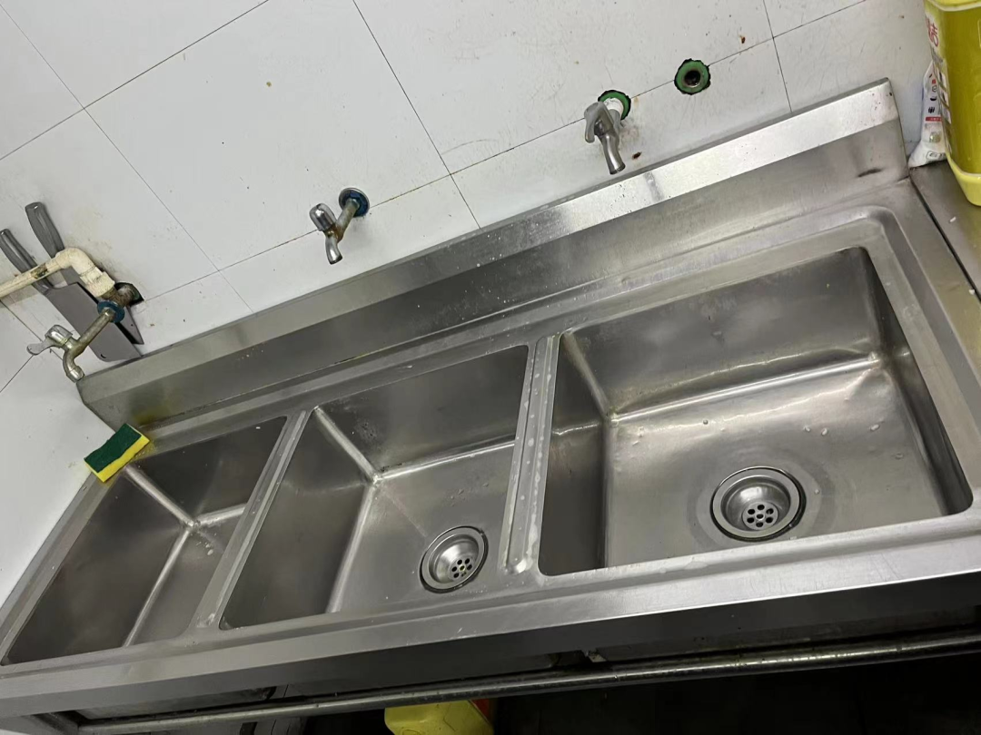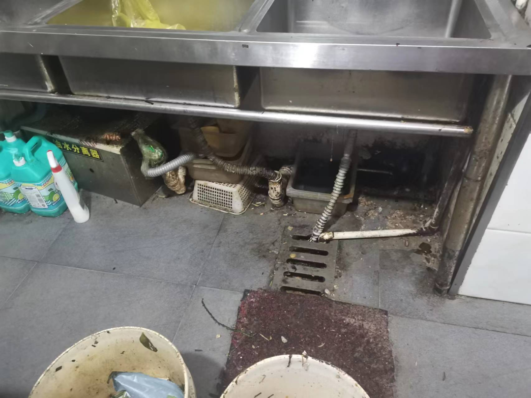 厨房卫生脏乱差,垃圾桶不加盖,厨房地面、墙面、操作台等到处都是厨余垃圾及油污。下水道长期未清理,已被厨余垃圾覆盖,散发恶臭。