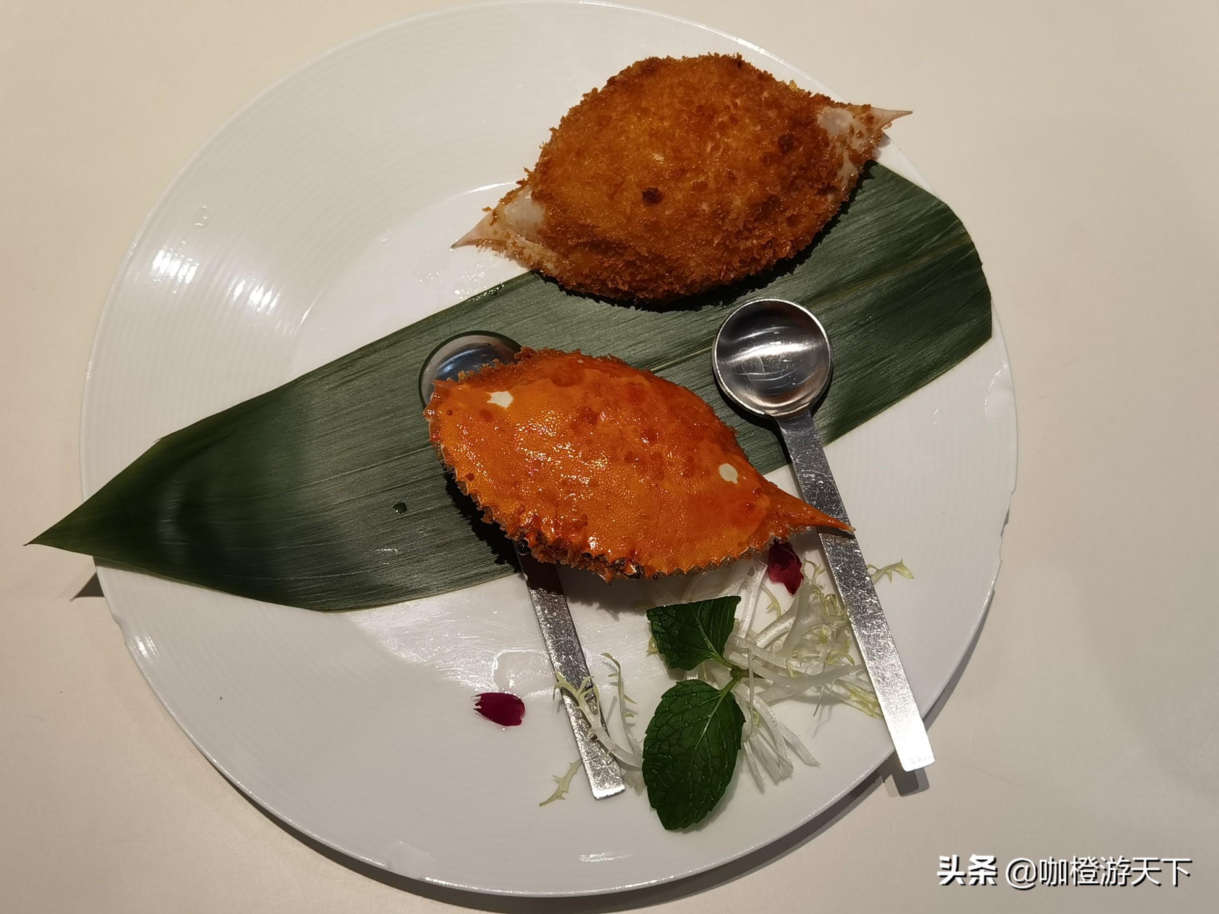 黄金蟹甲在制作过程中,利用了螃蟹的外壳作为容器,将馅料填入后,油炸而成。在摆盘上,两个蟹壳一正一反,在香叶的点缀之下,显得颇具美感。