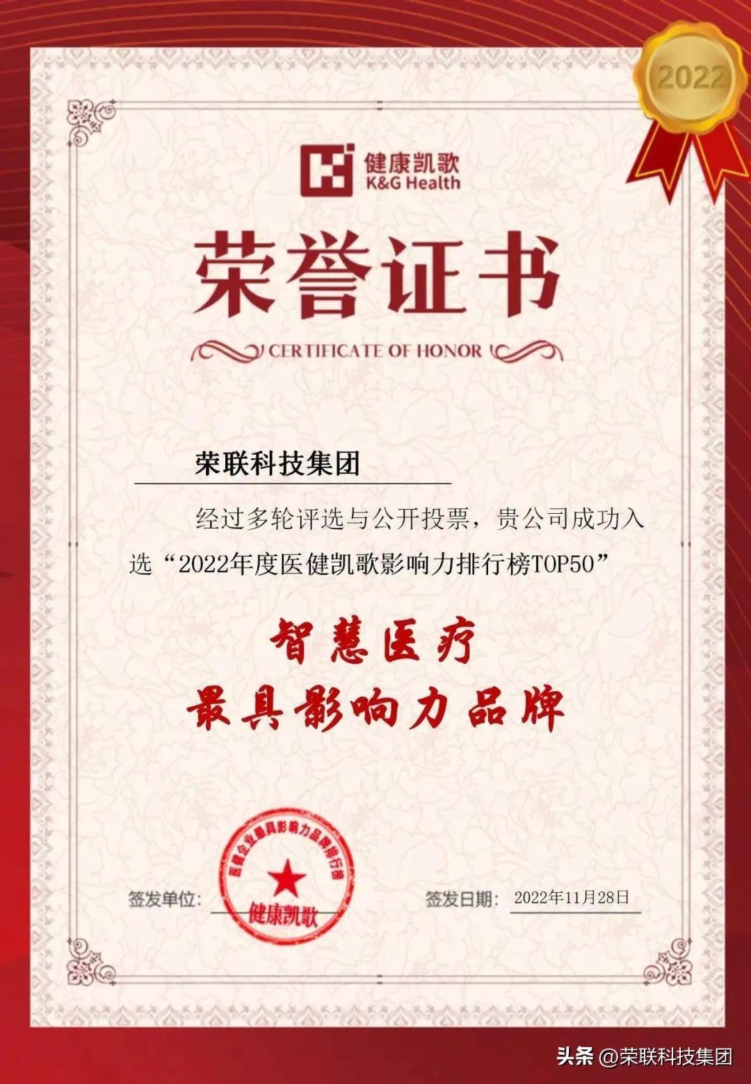 “2022年度医健凯歌影响力排行榜TOP50”是由医疗健康产业业内专家及用户投票产生的行业榜单,上榜企业均为医疗健康产业具公信力和影响力的行业代表。此榜单评选中,荣联科技集团获评“智慧医疗具影响力品牌”。