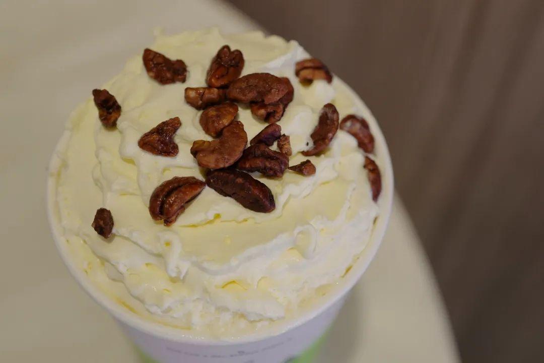 作为base在杭州的嬉游,看到古茗出龙井的奶茶很难不点一杯试试。这款其实和古茗之前的奶芙系列一样,上层都是奶油和碧根果的组合。