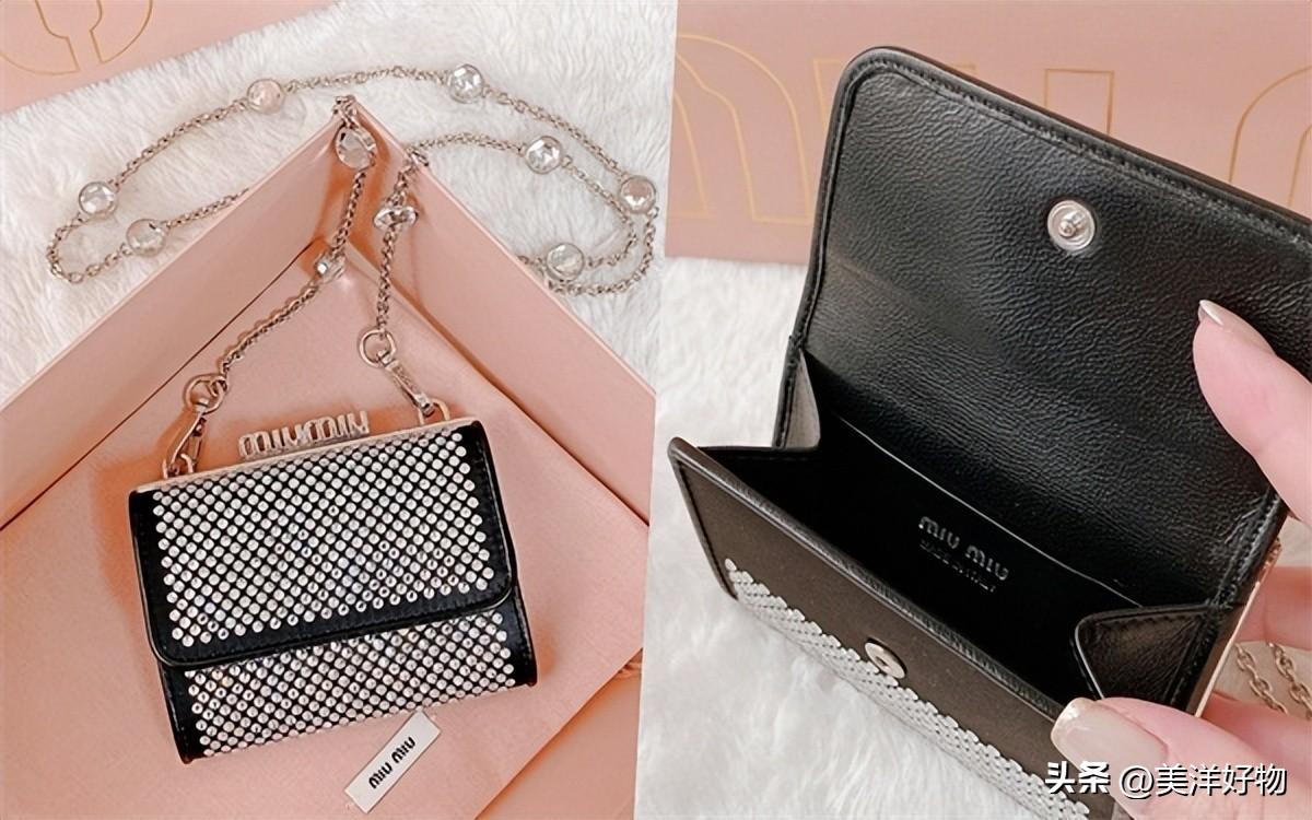 HK$14,300以品牌标志性的珍贵纳帕软皮缝制,搭配闪亮精致的人造水晶缀饰于包款表面,体现出Miu Miu独特的高贵优雅风尚,同时散发低调华丽的女人性感品味,主要两个口袋可分类收纳钞票零钱与卡片,其中搭扣零钱袋更以miu miu LOGO装饰更添特色,另外配有一条可拆除式镶嵌水晶的金属肩带,实际背上身加分整体造型!