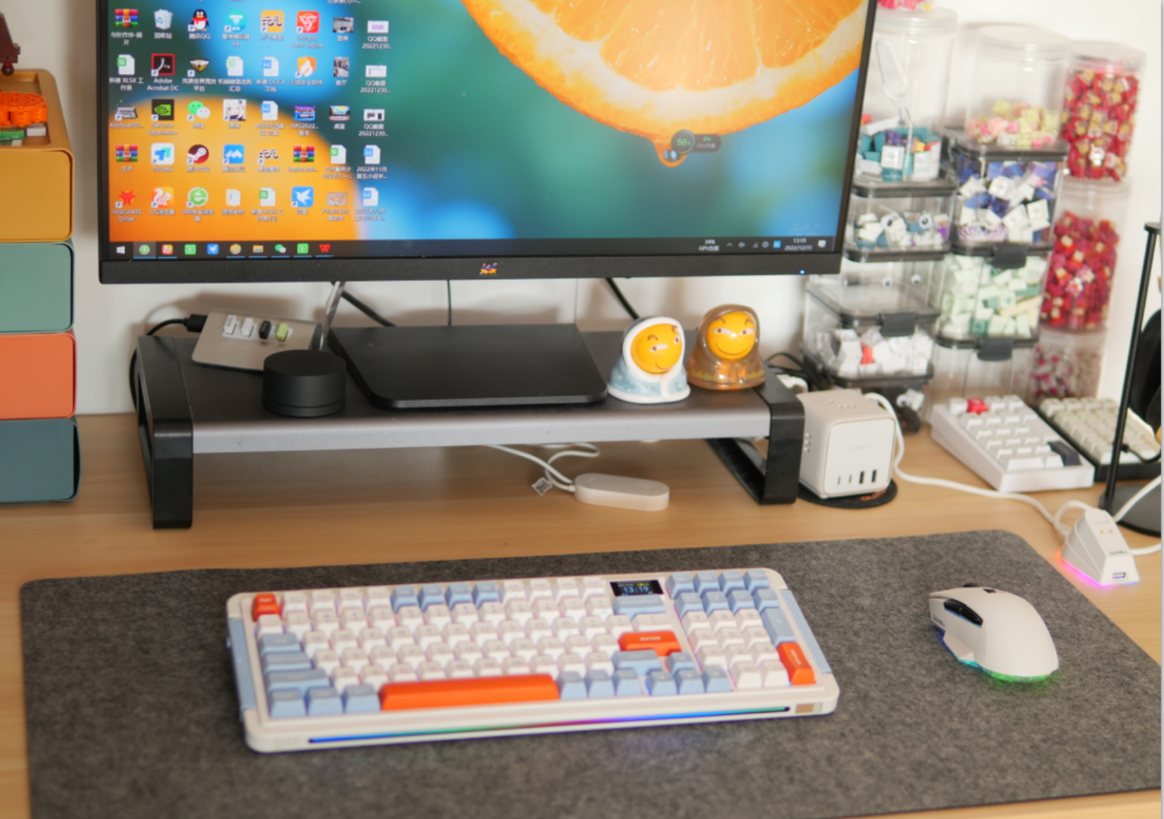 兔轴RGB版采用了白色轴心、透明底壳以及蜜桃色上盖的设计,不过这张图在阳光的照耀之下,偏色成了橙色。