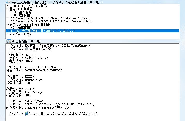另外这款软件还能读取到U盘的耗电情况,像铠侠这款,耗电量达到504mA,如果插到供电能力高只有500mA的USB 2.0接口上,就可能出现速度大幅下降和运行不稳定的情况,想要U盘高速运行,USB3.0接口是必须的。