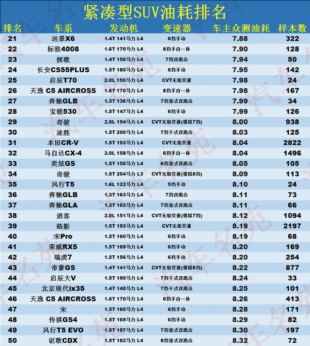 再来看下油耗排名21-50名的车型,其中远景X6、标致4008、大众探歌、长安CS55PLUS、启辰T70、雪铁龙天逸C5 AIRCROSS、奔驰GLB和宝骏530的油耗也都低于8L。而日产奇骏、本田CR-V、日产逍客、本田皓影、比亚迪宋Pro都排名前四十,百公里油耗低于8.2个油。本田CR-V搭载1.5T高功率发动机,其油耗要比丰田RAV4荣放(2.0L)高出0.3L左右。除此之外,荣威RX5、奇瑞瑞虎7和传祺GS4等国产SUV,综合油耗表现也比较出色。