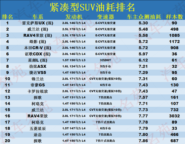 导读:近两年,SUV车型凭借自身独特的优势逐渐受到了消费者们的青睐,而像丰田RAV4荣放、大众途岳、日产逍客、吉利博越、长安CS75以及本田皓影等,都有着很不错的市场表现。那么在紧凑型SUV市场当中,哪些车型比较省油呢?近期紧凑型SUV油耗排名再次更新,1-133名出炉,前七名都是混动车型,而捷达VS5、丰田锋兰达、大众探歌、丰田威兰达、丰田RAV4荣放和大众途岳都排名前二十名,百公里油耗都不足8个油。而长安CS55 PLUS、本田CR-V、日产奇骏、日产逍客、本田皓影、奇瑞瑞虎7和传祺GS4等主流车型,油耗表现也很出色。SUV油耗排名更新:1-133名,前七名都是混动,威兰达、途岳低于8L!