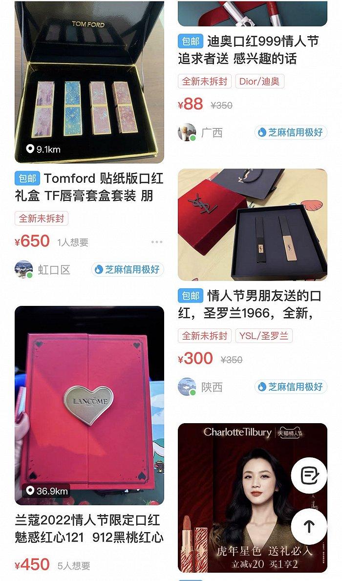 界面时尚在二手转售平台闲鱼上发现,不少用户发布了情人节礼物的转售信息,其中不乏口红香水、珠宝首饰、鲜花礼盒等节日礼物的常客,甚至还出现了价格更为高昂的品包袋。而觉察到这一风潮的闲鱼还专门推出了“转卖你的心碎礼物”的活动,鼓励用户处理受到的不适用礼物。