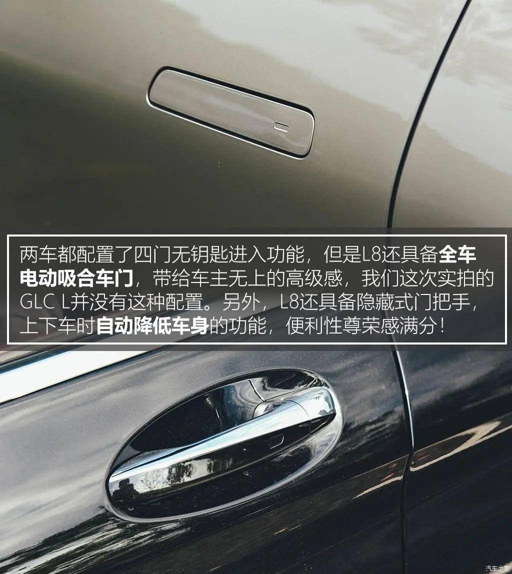 这是两车差异大的地方。一辆为增程混动车型,一辆为传统的燃油车型。大家关心的纯电续航里程,L8为168km(WLTC标准),看似不高,但是大家别忘了这是一辆增程式混动车型,只要找得到加油站,它就能一直开下去(虽然加速成绩要看当时电量而定)。厂家公布的0-100km/h加速成绩为5.5秒。而GLC 300 L 4MATIC则是搭载高功版的M264 2.0T发动机,匹配奔驰自家的9AT变速箱,想必大家已经熟悉这个动力配置。