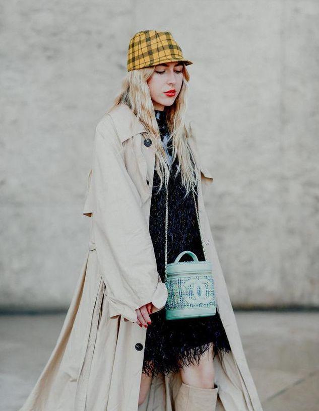 香奈儿的水桶包是清新的蓝调,有一点复古的气息,唯美的格纹设计带来梦幻的视觉感,搭配潇洒的风衣,整体造型显得灵动优雅。