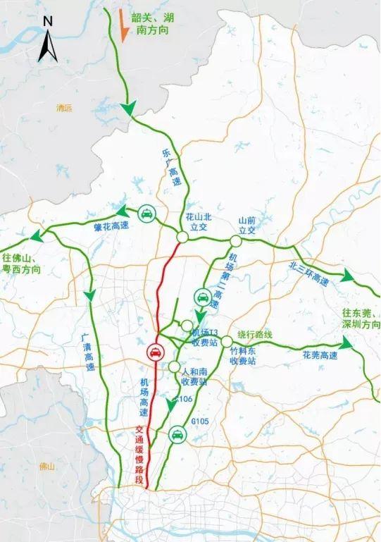 大广高速返程绕行指引3.机场高速绕行指引。建议来自韶关、湖南方向车主高峰时期可以通过北三环-机场二高或地面道路绕行。建议来自机场的旅客高峰时期可以通过花莞高速、鹤龙路(G106)或其他地面道路绕行。