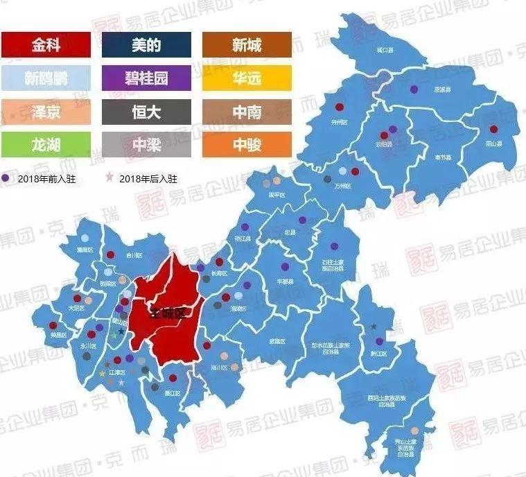 中骏虽17年才开始进驻重庆,短短时间内已在大重庆范围内布局10个项目,其中首入重庆便通过收并购的方式布局双福,之后趁势在双福梅开二度,布局方式以主城为核心,区县机会布局为主,18年便位列TOP20榜中,后期实力不容小觑,除上榜企业外,美的、中南等新进房企机会进入一小时经济圈内的璧山、江津等热门区县成为。