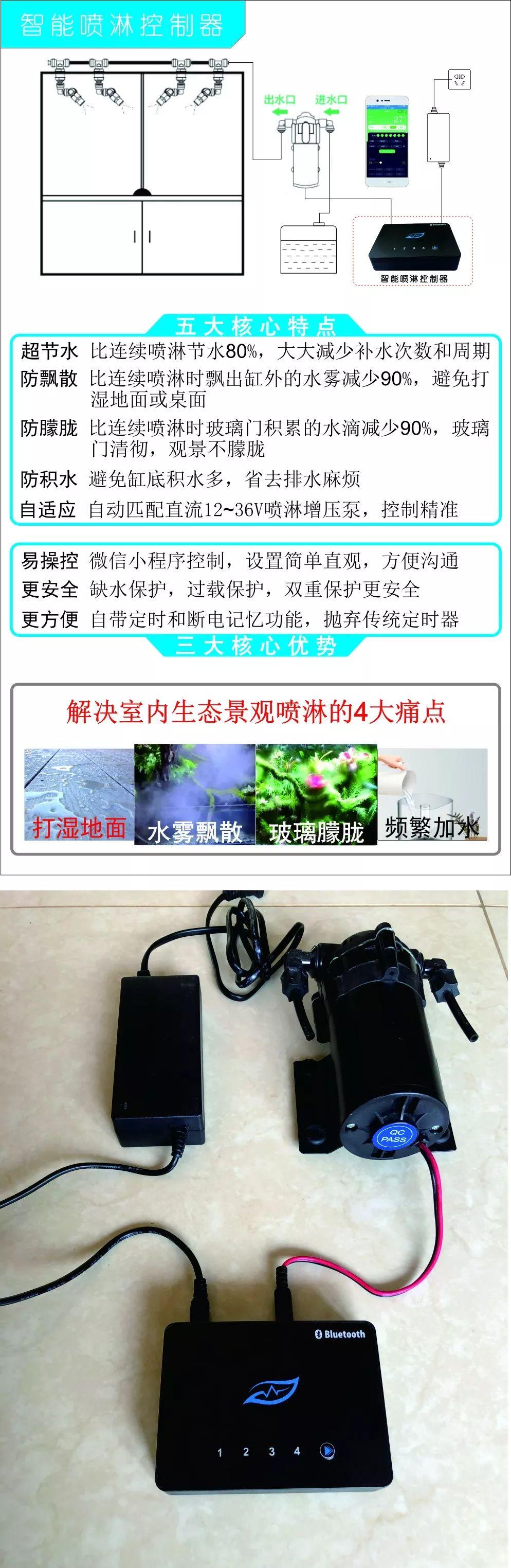 本产品采用自主核心专利技术,以控制喷淋系统实现脉冲喷雾,适用于控制雨林缸,水陆缸,以及室内外园艺的喷淋系统;节水80%,大大减少喷淋系统的补水次数和周期,减少90%的水雾飘出缸外,避免打湿地面或桌面 减少玻璃门上90%的水滴积累,使玻璃门清彻,观景不朦胧,大大减少水渍产生;避免缸底积水,省去排水麻烦。本产品自动匹配12~36V喷淋增压泵,控制;具有缺水保护和过载保护;自带定时和断电记忆功能;支持微信小程序控制。