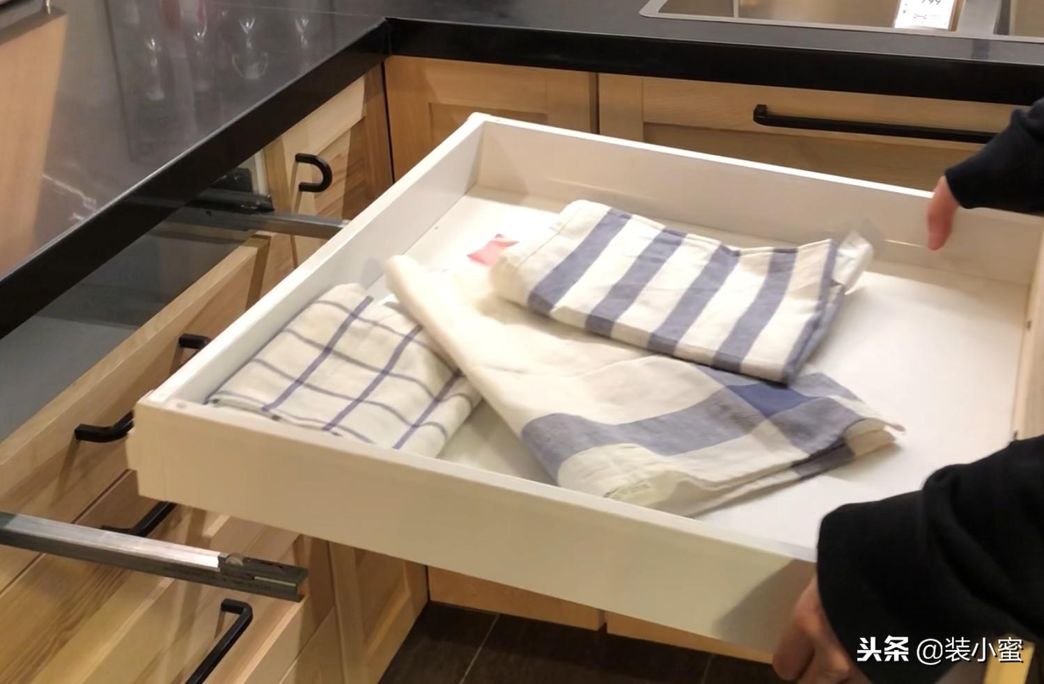 至于橱柜的抽屉则是根据框架的大小设置,其中比较有意思的是,宜家橱柜的抽屉有一种“抽屉包抽屉”的设计,这个设计将底柜的竖向空间充分利用,不浪费分毫。