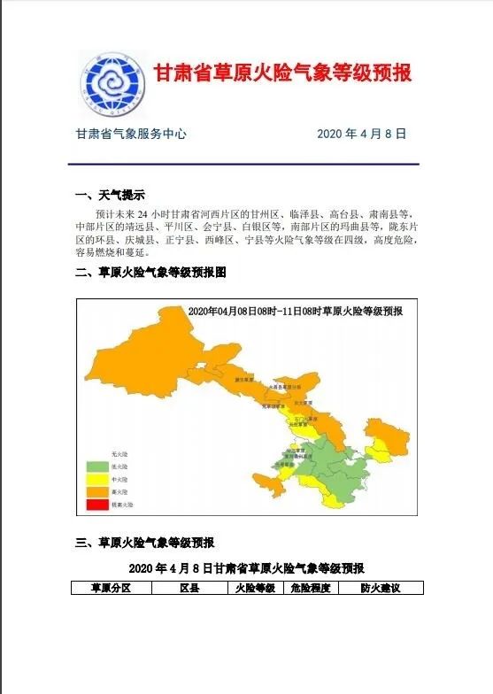 预计未来 24 小时甘肃省河西片区的甘州区、临泽县、高台县、肃南县等,中部片区的靖远县、平川区、会宁县、白银区等,南部片区的玛曲县等,陇东片区的环县、庆城县、正宁县、西峰区、宁县等火险气象等级在四级,高度危险,容易燃烧和蔓延。