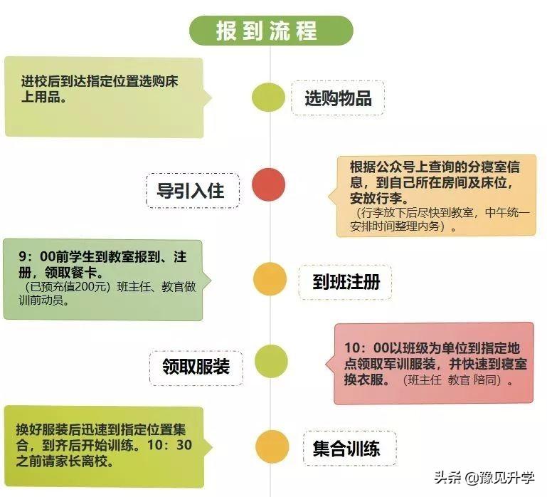 报到流程:8月22日学校南门查询分班、宿舍安排→办理入学手续→学生领取床上用品及校服→安排宿舍,家长离校→学生进班集合,开班会。