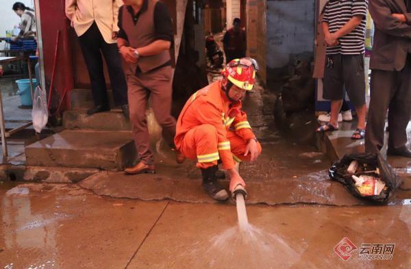 镜头三:19时20分宣威市消防救援大队接到报警,宣威市老人民医院对面小北门街发生内涝,宣威市振兴街消防救援站出动1车7人前往处置,19时40分到达现场,现场多家住户被淹,无人员被困。其中一住户家中情况较为严重,屋内积水近1米,其余住户被淹情况轻微。救援人员首先将受灾住户电闸全部断开,随后展开紧急救援,救援行动分两组进行,一组负责组织轻微受灾住户开展自救,另一组利用手抬机动泵对受灾严重的住户进行排水,20时13分,该区域受灾住户内积水全部排除。