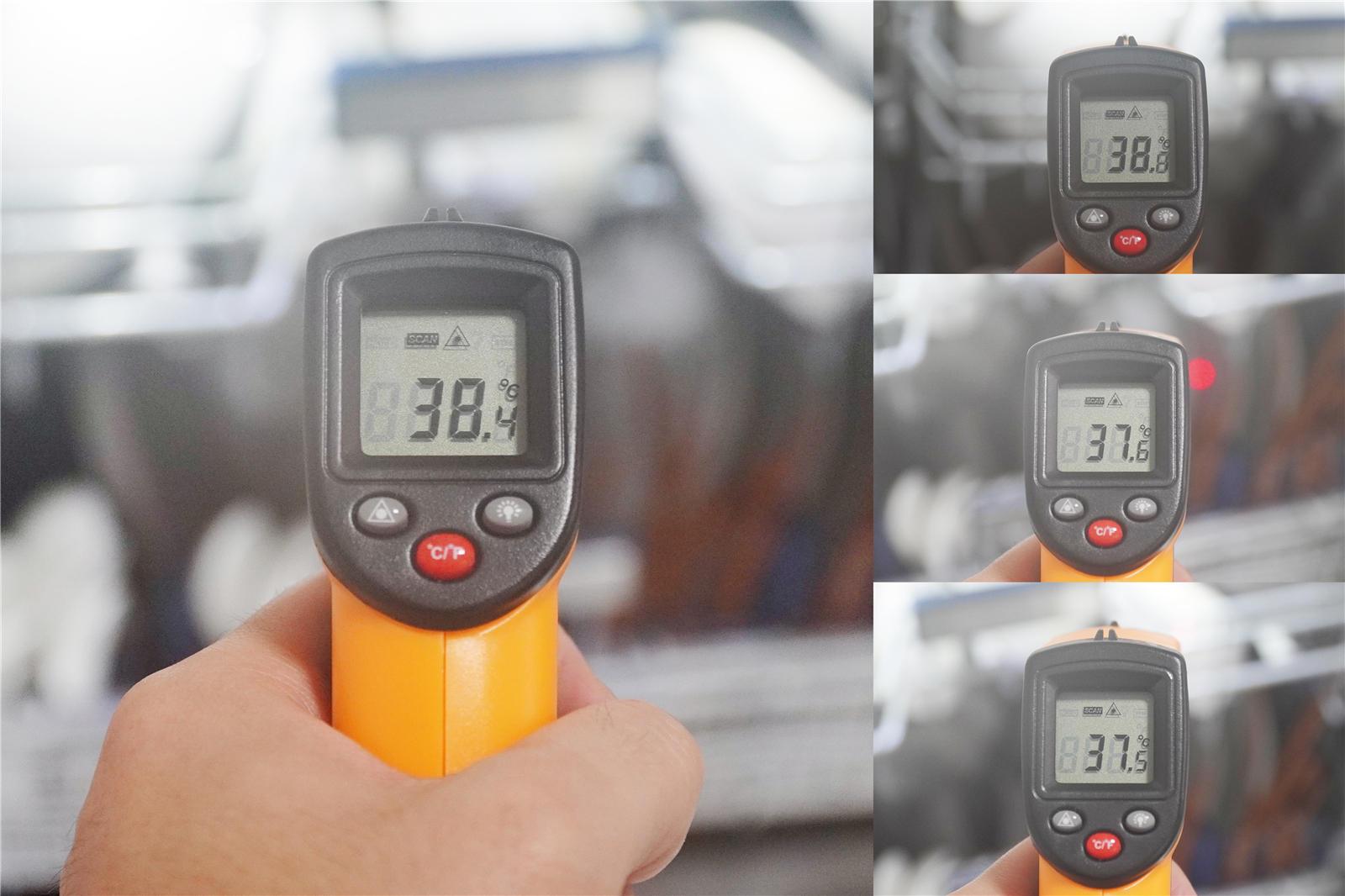 用红外温度检测仪简单测了一下,餐具表面的温度在38度左右。
