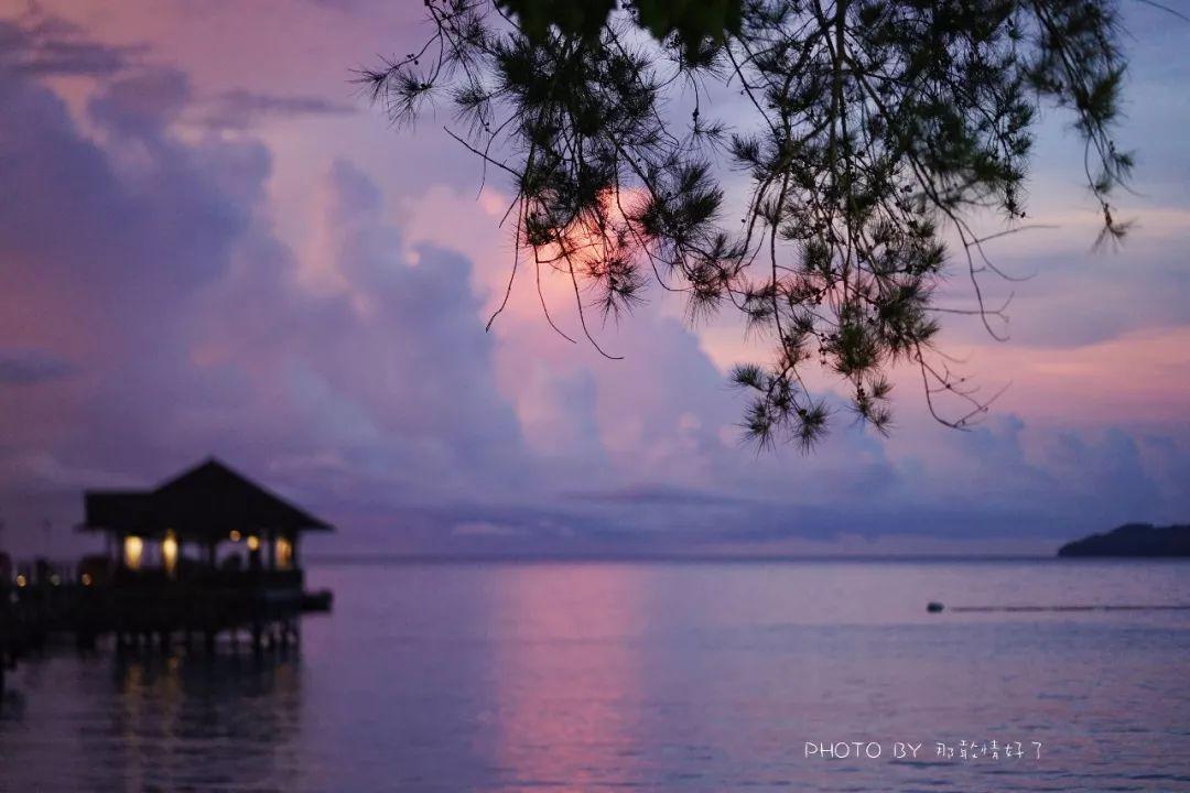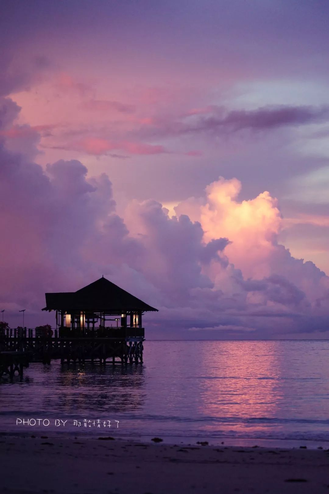 海上木亭、码头、栈道在夕阳中的剪影,背靠着无比纯美的粉紫色天际,可以和摩洛哥丹吉尔的夕阳媲美了。