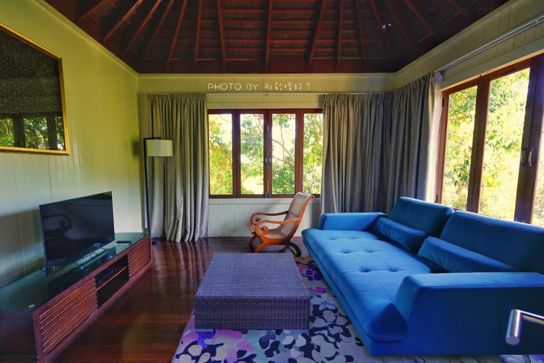 床特别大,足够一家三口睡,床品也很舒服。两个空调,不论室外多么炎热,室内永远凉爽沁人。房顶是起尖的设计,并用马来纹饰装点,吊扇也是热带植物的样子。全部的木制家具、木地板,配上漂亮的大地毯,很多电影电视台可看,并且是BOSE音响系统,让我不想走出房间。