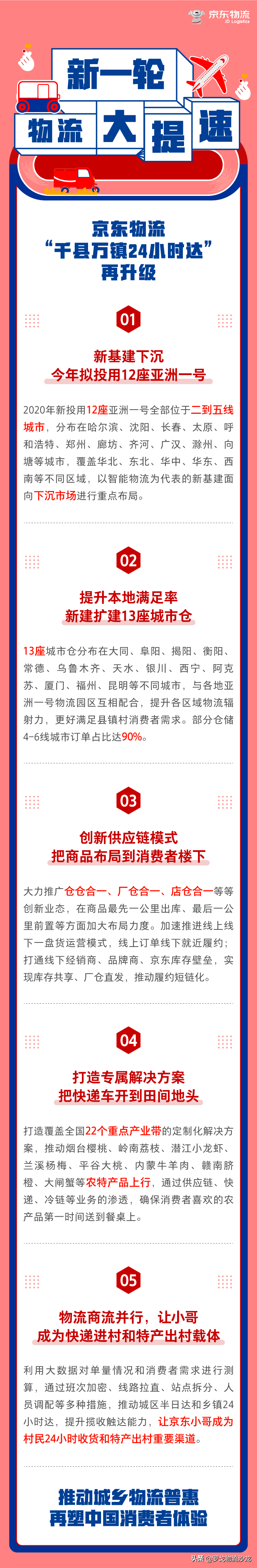 6月8日,京东物流表示,2020年将升级“千县万镇24小时达”时效提升计划,以新基建下沉、仓储模式创新、产业带打造、生鲜冷链物流建设和快递进村等核心措施,继续强化物流基础设施能力。