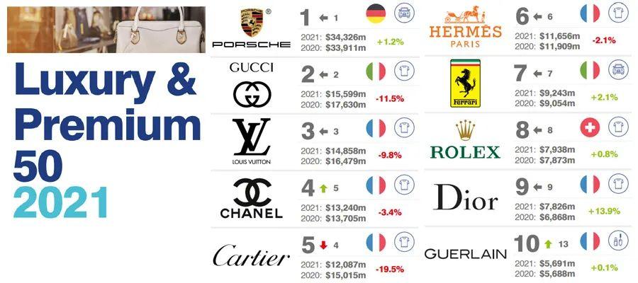 英国品牌评估机构“品牌金融”(Brand Finance)发布“2021和品牌价值50强”排行榜(Luxury & Premium 50 2021)。德国品牌保时捷、意大利品牌古驰、法国品牌路易威登蝉联前三位。中国香港的酒店品牌香格里拉上榜。
