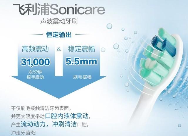 飞利浦Sonicare声波震动牙刷HX6730采用创新的声波震动技术,卡入式刷头产生的声波震动可达31000次/分钟,5.5mm的刷毛摆幅,产生流动洁力,可轻松深入清洁齿间缝隙,相比手动牙刷,能够有效去除多达7倍的牙菌斑,焕白牙齿,并显著改良牙龈健康。
